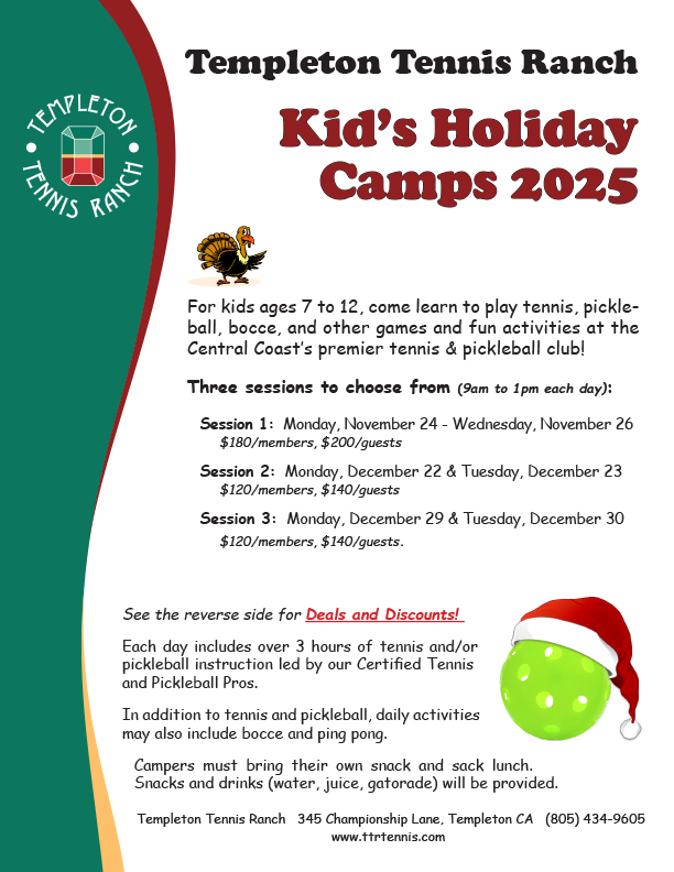 For ages 7 to 12, come learn to play tennis, pickleball, bocce, as well as other fun activities, all at the Central Coast's premier tennis, pickleball and swim club!